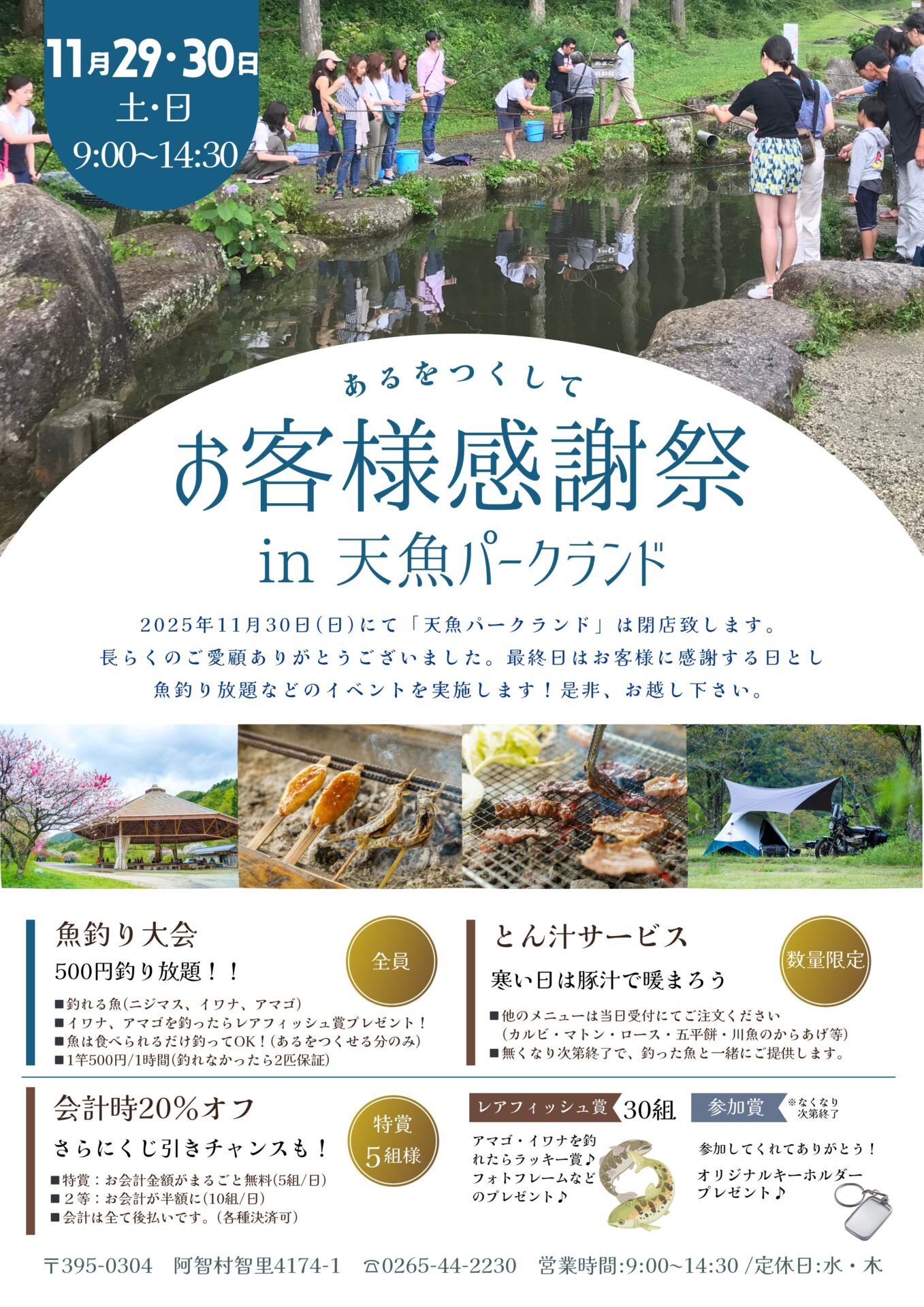 最終営業日前の週末、長年のご愛顧に感謝を込めて天魚(あまご)パークランド全体でイベントを行います。ご家族・ご友人と、ぜひ最後の思い出づくりにお越しください。